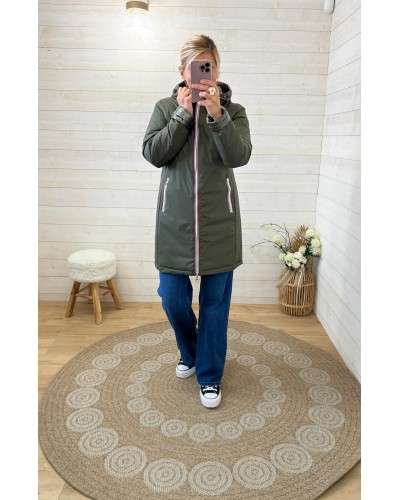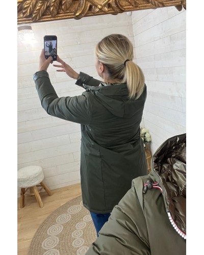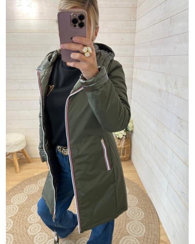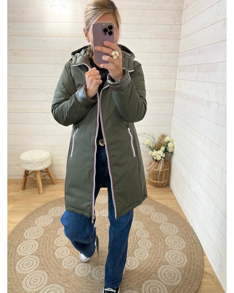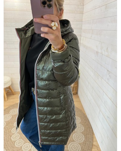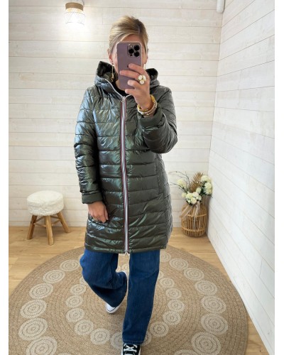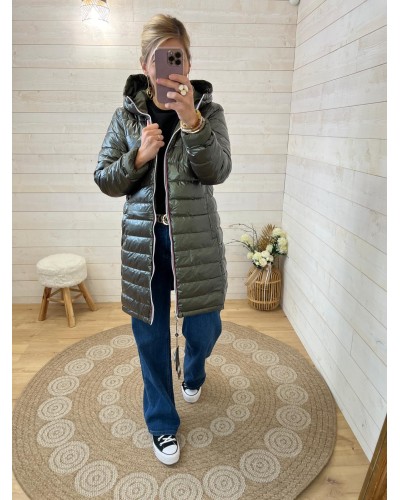 Doudoune réversible kaki mat et kaki brillant avec capuche - version mi longue