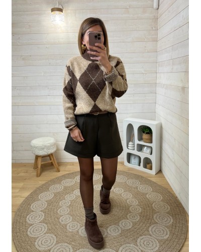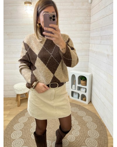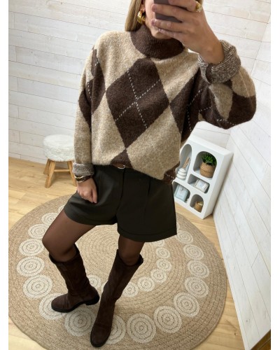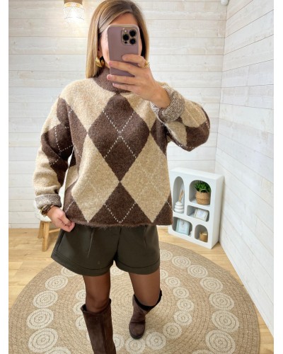 Pull avec motif losanges dans les tons beige et chocolat, apportant un style rétro chic et très tendance.